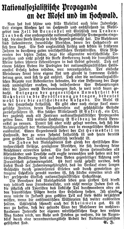 Brauneberg. Mit einem einstimmigen "Ja" hat sich der Gemeinderat Brauneberg dafür ausgesprochen, im Ort Stolpersteine verlegen zu lassen. Diese sollen an ehemalige Mitbürger, vorwiegend Menschen jüdischen Glaubens, erinnern, die Opfer des Nationalsozialismus wurden..." |