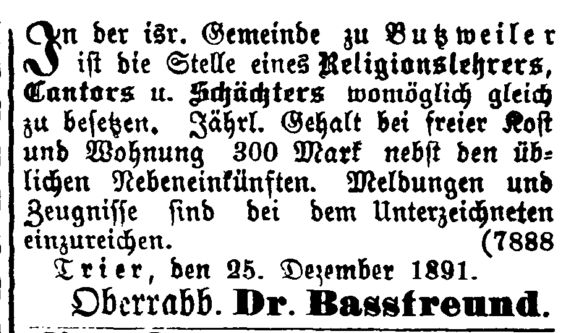 Religionslehrer angestellt, der zugleich als Vorbeter und Schochet tätig war (s.u. Ausschreibungen
