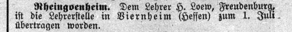 Gemeindebundes 1889 S. 35). In den Jahren vor 1910 war Lehrer Heinrich Loew, der
