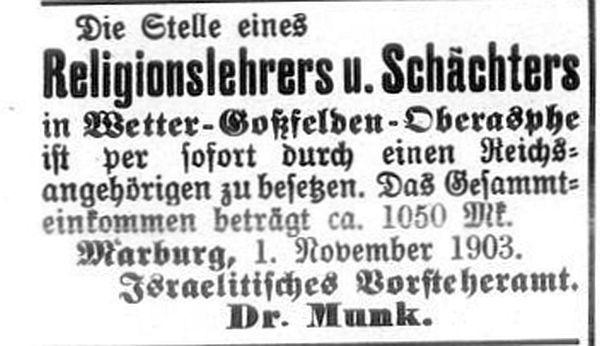 im "Israelitischen Familienblatt" vom 5. November 1903: "Die Stelle