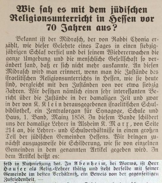 Bekannt ist der Midrasch, der von Rabbi Chonia erzählt, wie dieser Gelehrte eines Tages in einen siebzigjährigen Schlaf verfiel und bei seinem Wiedererwachen die ganze Umgebung und die menschliche Gesellschaft so verändert fand, dass er sich nicht mehr auskannte. An diesen Midrasch wird man erinnert, wenn man die Zustände des israelitischen Religionsunterrichts in Hessen, wie sie heute sind, vergleicht mit den Zuständen von vor etwa siebzig Jahren. Wir besitzen nämlich einen sehr interessanten Bericht über die Zustände in der damaligen Zeit und zwar in der von K. Klein herausgegebenen israelitischen Schulbibliothek, ein Zentralorgan für Synagoge, Schule und Haus, 1. Band, Mainz 1858. In diesem Bande schildert uns der damalige Lehrer in Alsheim K. Marx von Seite 214 an, die Lehrer- und Schulverhältnisse in einem großen Teil der jüdischen Gemeinden Hessens. Wir bringen zunächst auszugsweise die Schilderung, wie sie von einzelnen Gemeinden in dem genannten Artikel gegeben wird. In dem Artikel heißt es: ....