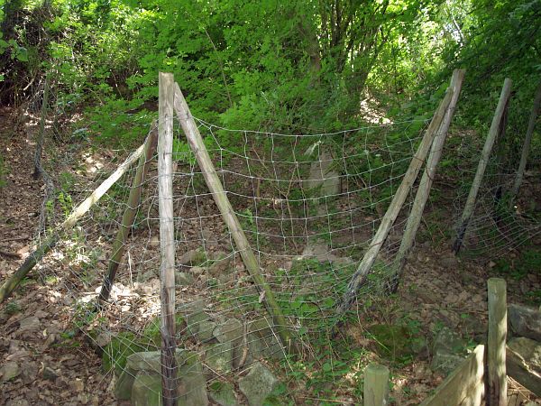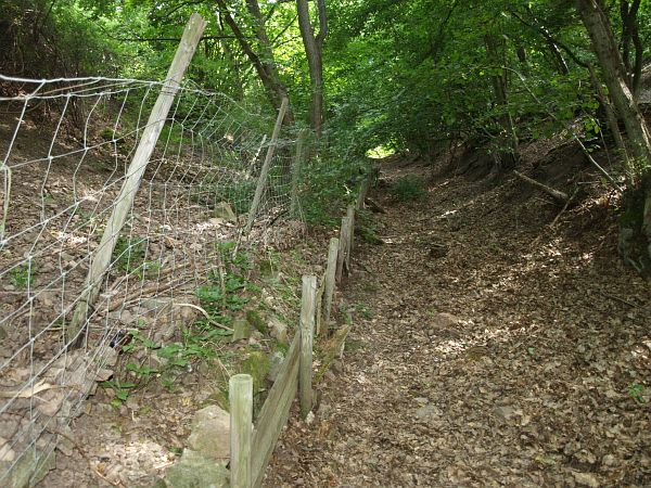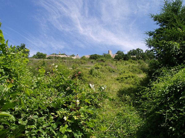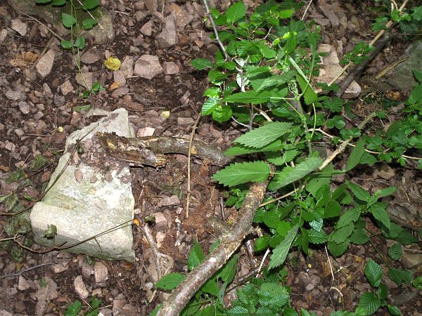 eine Geröllhalde, teilweise mit Brombeerhecken und Brennnesseln überzogen, mit