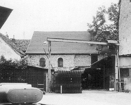 Alzey vor der Rückseite der Synagoge zu Alzey, 1917.