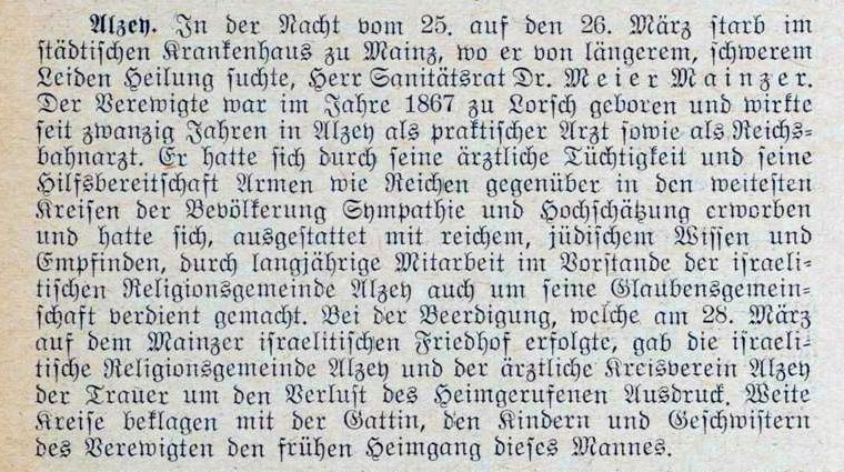 Zum Tod von Sanitätsrat Dr. Meier Mainzer (1909 bis 1929 praktischer Arzt in
