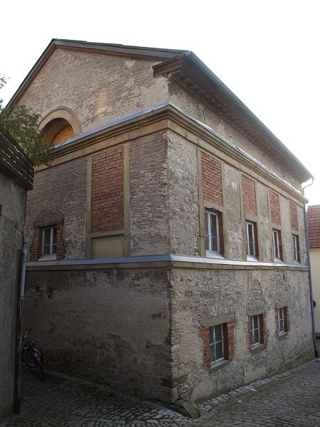 auf das Synagogengebäude von Nordosten; im Bereich unterhalb des