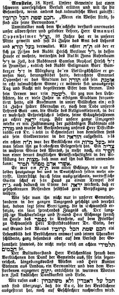 Gelehrte Emanuel Oppenheimer (1885 bis 1909, siehe Nachruf unten). An