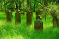 des Friedhofes sind viele Grabsteine in den Boden eingesunken. Das jüngste Grab