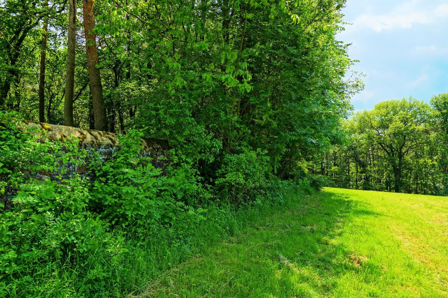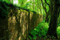einer massiven, teilweise von Efeu bewachsenen Steinmauer umgeben.