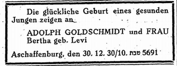 Anzeige in der Zeitschrift "Der Israelit" vom 1. Januar 1931: