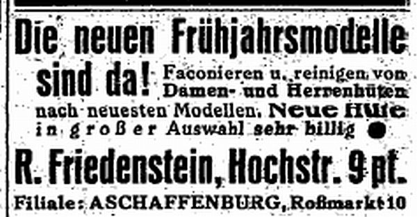 des Hutgeschäftes R. Friedenstein, Filiale in Aschaffenburg (1935)