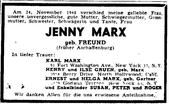 für Jenny Marx geb. Freund,