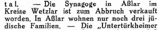 der jüdischen Einwohner von Aßlar verzogen oder ausgewandert. Die Hermannsteiner jüdischen Einwohner konnten nach den USA beziehungsweise nach
