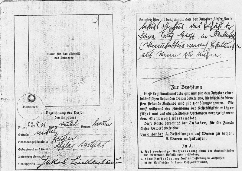 für Jacob Lindenbaum (geb. 22.8.1911 in Aßlar) als Reisender der Firma