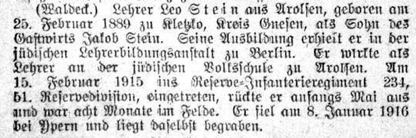 Weltkrieg war in der Gemeinde Leo Stein als Lehrer an der Religionsschule tätig.