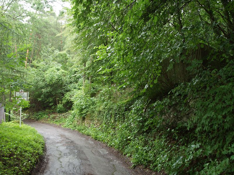 Zufahrt mit Aufschrift "Gasthaus Sennhütte" ab. Unmittelbar gegenüber