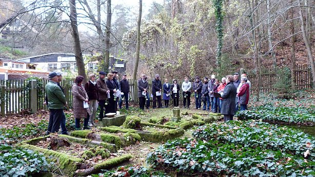 des Friedhofes stehend, mit der Inschrift (hebräisch Jiskor - gedenke):