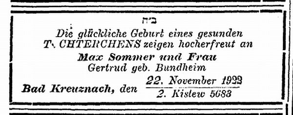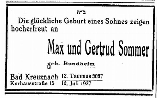 Familienanzeigen der Familie Max und Gertrud Sommer (1921/1927)