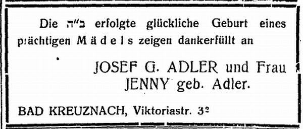 Geburtsanzeige für die Tochter von Josef und Jenny Adler (1921)