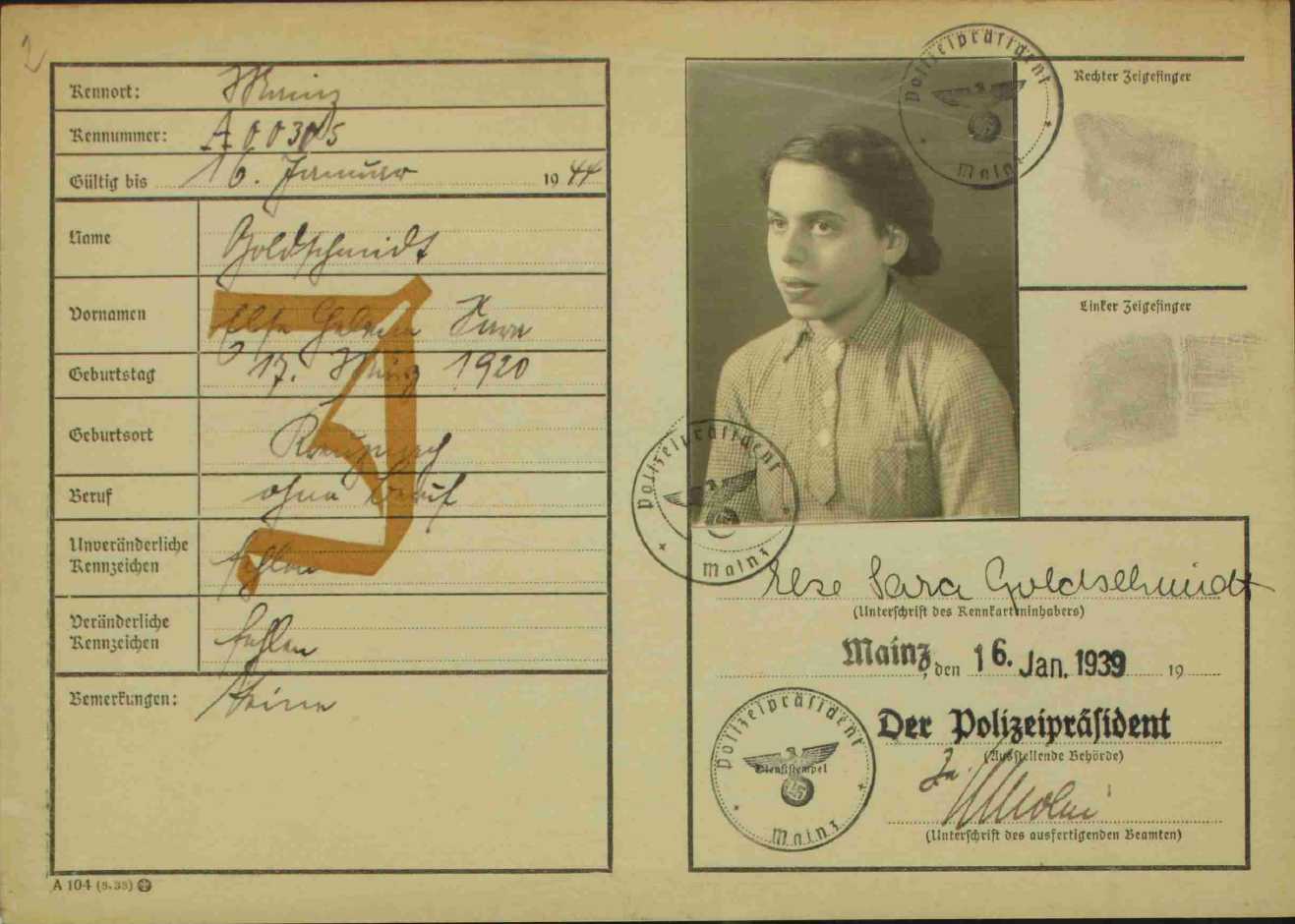 in Mainz 1939) für Else Goldschmidt (geb. 17. März 1920 in Bad