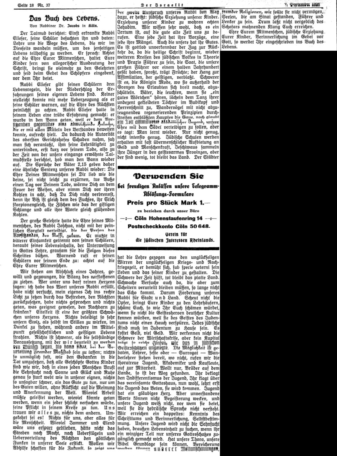 in der Zeitschrift "Der Israelit" vom 27. März 1930: "Wer