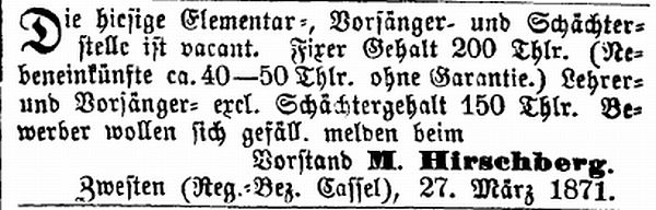 zugleich als Vorbeter und Schochet fungierte (vgl. Ausschreibungen der Stelle