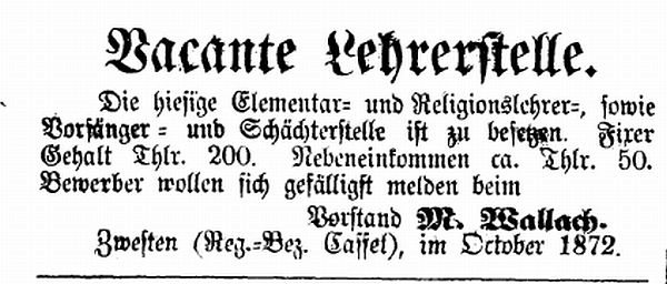 unten). Zunächst bestand nur eine Religionsschule in Zwesten, nach 1870 (siehe Ausschreibungen unten von 1871/72 mit der Suche nach einem
