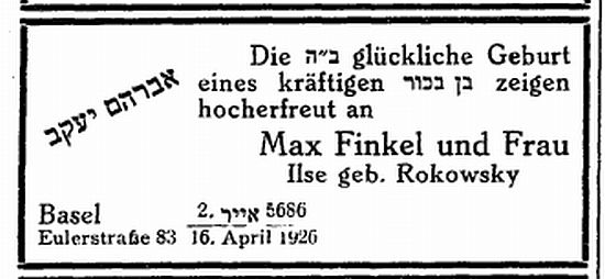 Geburtsanzeige für Abraham Jakob Finkel (1926)