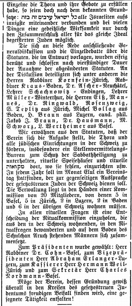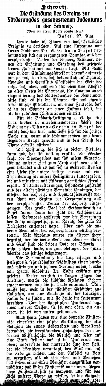 gegründete 'Schweizer toratreue Zentralverein' im Baseler