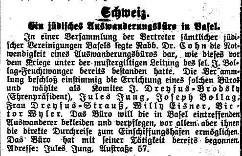 Basel wird ein jüdisches Auswanderungsbüro eröffnet (1920)