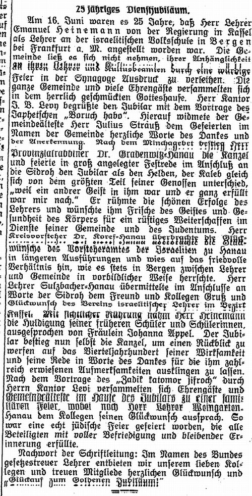 Lehrer, Kantor und Schochet war (bereits seit 1902, siehe Bericht unten) Emanuel Heinemann angestellt (auch 1932). 1932