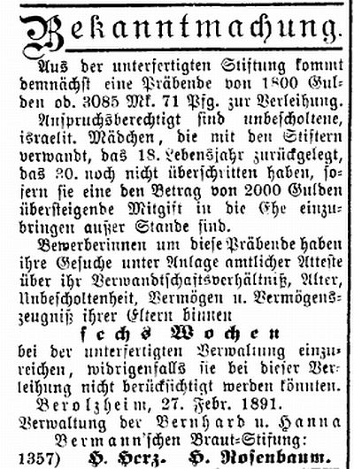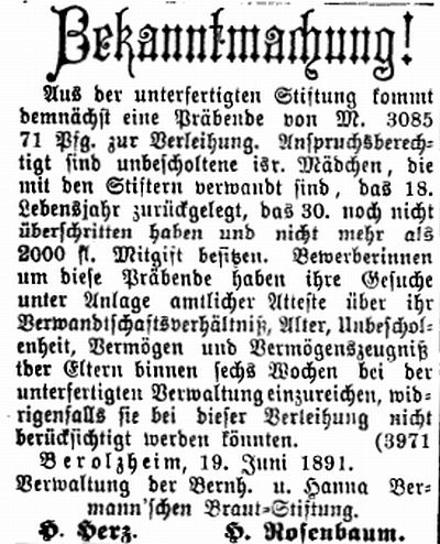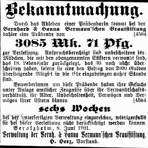 "Bernhard und Hanna Bermann'sche Braut-Stiftung" (vgl. Ausschreibung