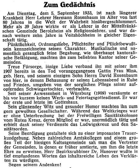 Würzburg starb. Von 1913 bis 1925 war Lehrer Edmund Hirsch; letzter jüdischer Lehrer war Ludwig Stein