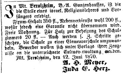 Gemeinde gehörte dem Bezirksrabbinat Ansbach an.