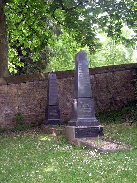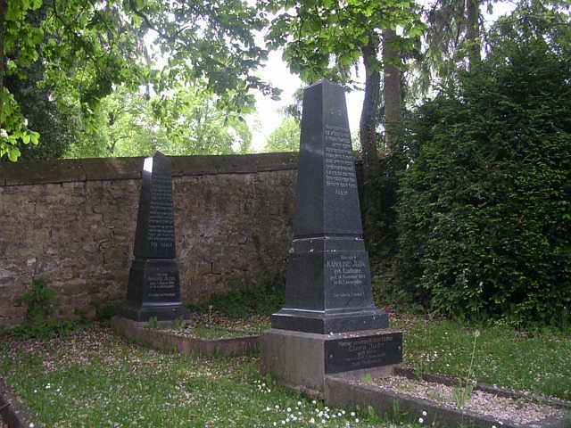 Auf dem Friedhof sind noch fünf Grabsteine, alle in Form von Obelisken