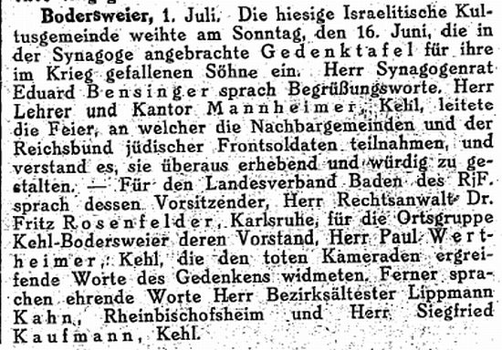Bensinger (geb. 24.12.1895 in Bodersweier, gef. 11.8.1916) und Joseph Wertheimer