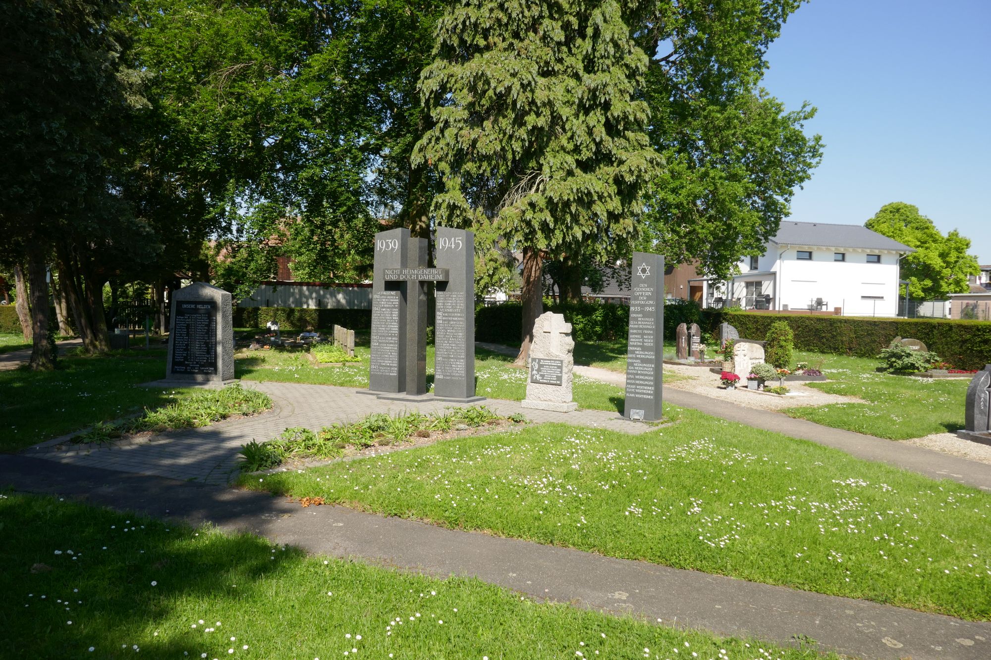 Gedenksteine im kommunalen Friedhof: von links das Gefallenendenkmal