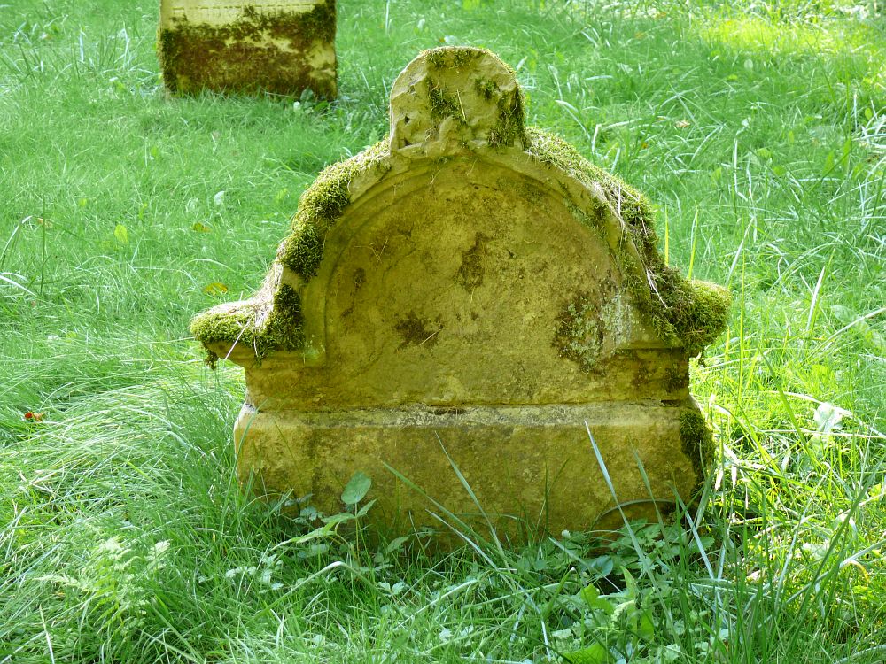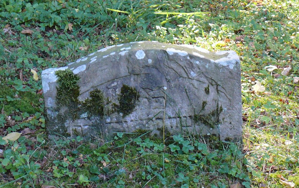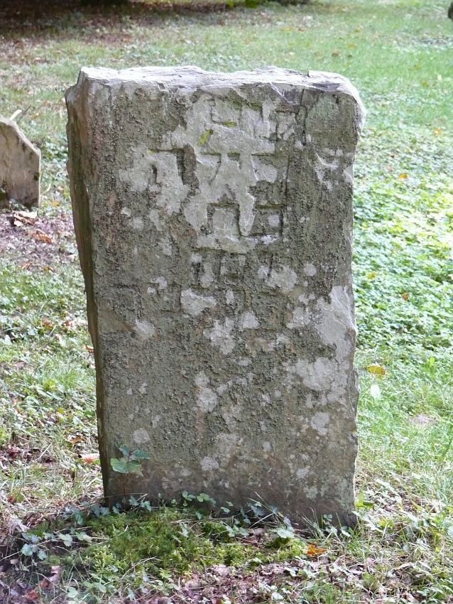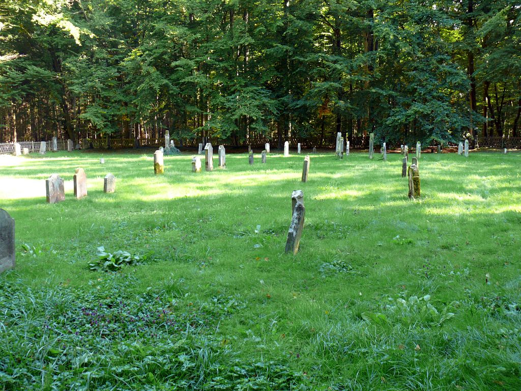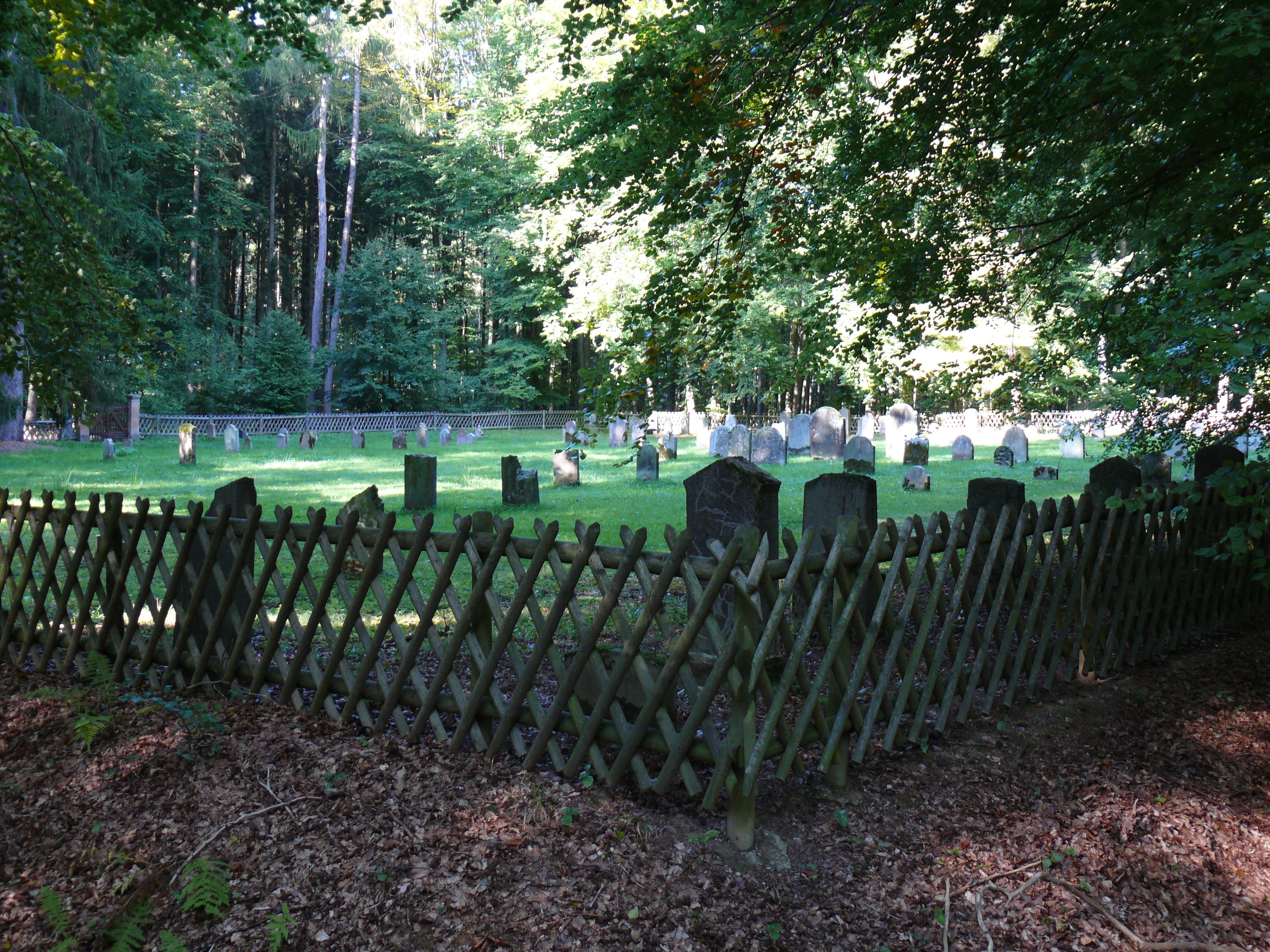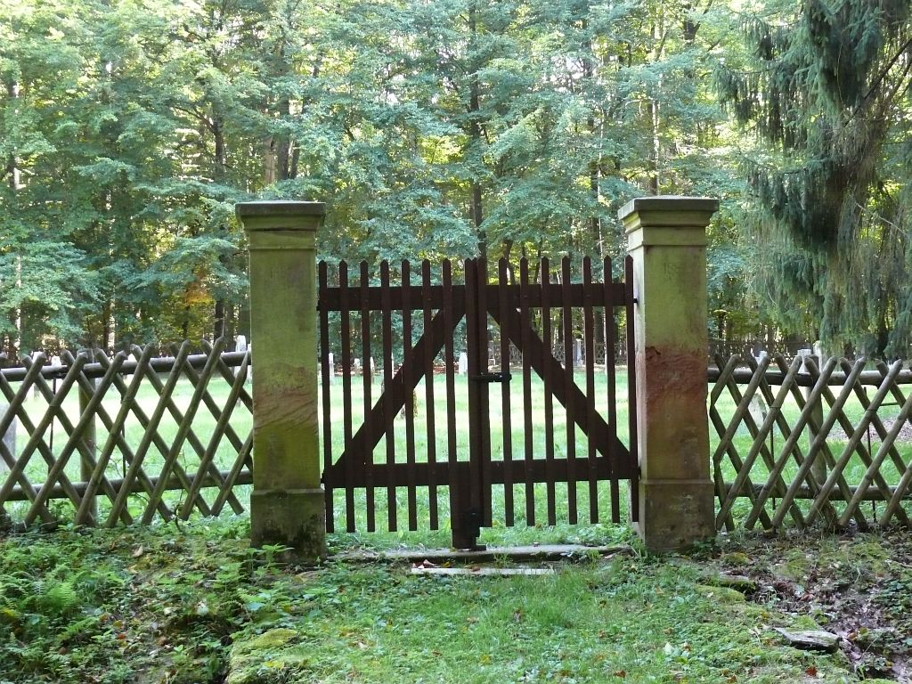 hundert Metern links im Wald verborgen. Den Friedhof umgibt ein tiefer Graben.
