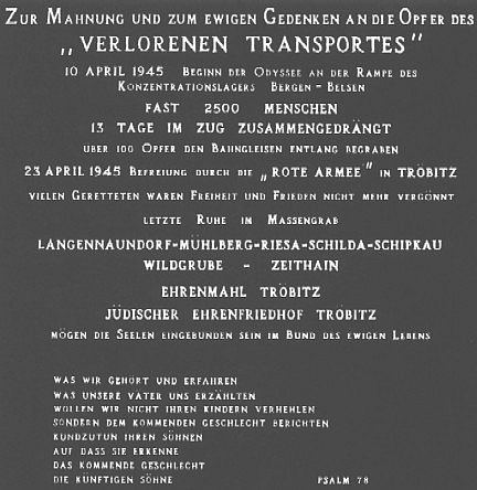 'verlorene Zug', der am 16. April 1945 in Zernitz von Tieffliegern beschossen wurde, kam aus dem KZ Bergen-Belsen und nicht aus Theresienstadt, wie auf dem Zernitzer Gedenkstein in hebräisch und deutsch zu lesen ist. Und er regte an, die Toten, die an einem Waldrand auf Kirchenland in Zernitz-Bahnhof ruhen, auf einer Tafel namentlich zu nennen. Martina Staats übergab damals dem Neustädter Amtsdirektor Ulrich Gerber eine Liste mit den 45 Namen.