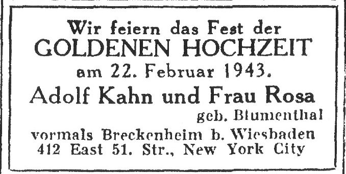 die USA. Adolf Kahn (geb. 1861 in Breckenheim, Haus Pfanngasse 1) war seit 1893 mit Rosa