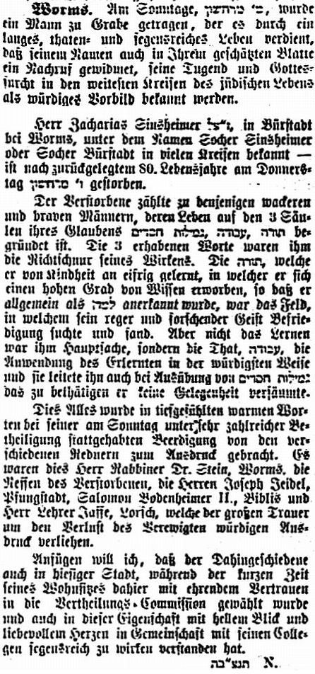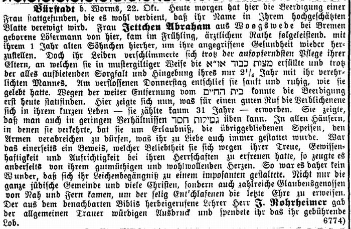von Jettchen Abraham 1893 (s.u.) sprach Lehrer J. Rohrheimer aus Biblis.