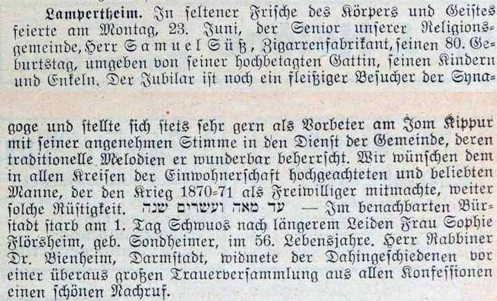 Ort, 1807 erstmals der Familienname Sondheimer beziehungsweise