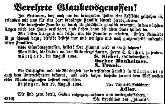 Bütthard, im August 1884. S. Sichel, Kultusvorstand, Oscher