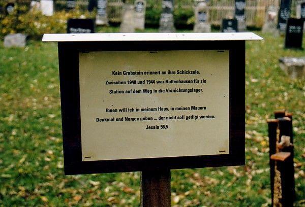 Hinweistafel mit Angaben zu ihrer Geschichte (der Weg zum Friedhof ist von der
