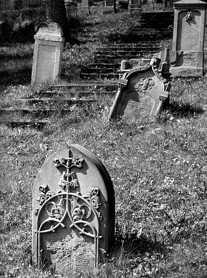 erkennen, die Grabsteine verwittert und verfallen und in die Erde gesunken.