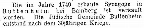 Bamberg ist verkauft worden. Die Jüdische Gemeinde Buttenheim entstand
