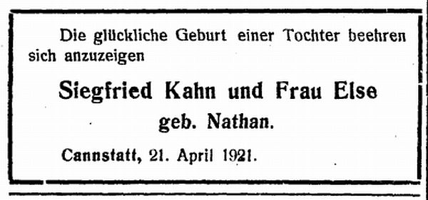 Geburtsanzeige einer Tochter von Siegfried Kahn und