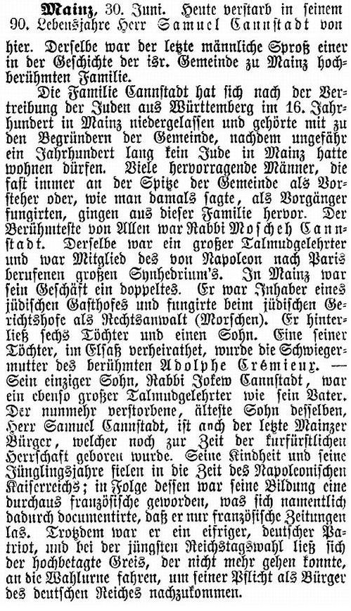 Zum Tod von Samuel Cannstadt in Mainz (1881)