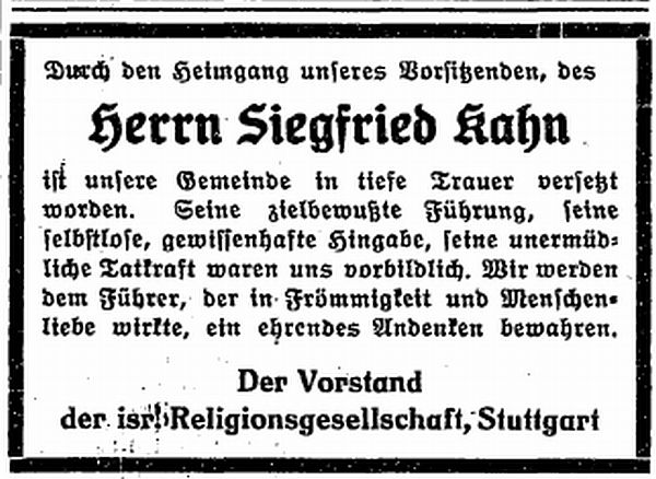 Religionsgesellschaft, e.V., Stuttgart. Der Vorstand: Siegfried Kahn,