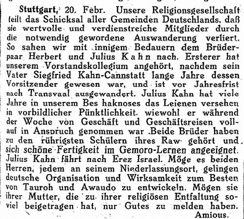 der Zeitschrift "Der Israelit" vom 26. Februar 1925: "An unserer