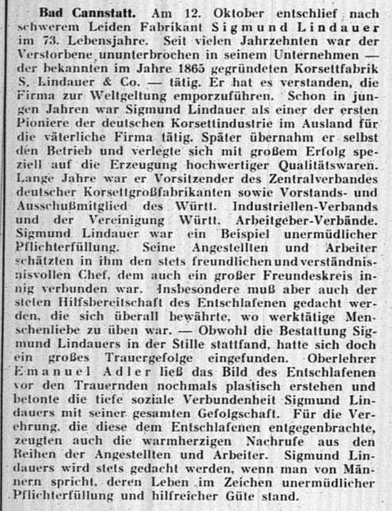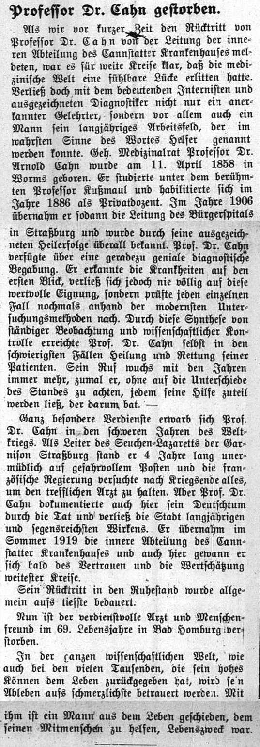 Heute verstarb in seinem 90. Lebensjahre Herr Samuel Cannstadt von hier.